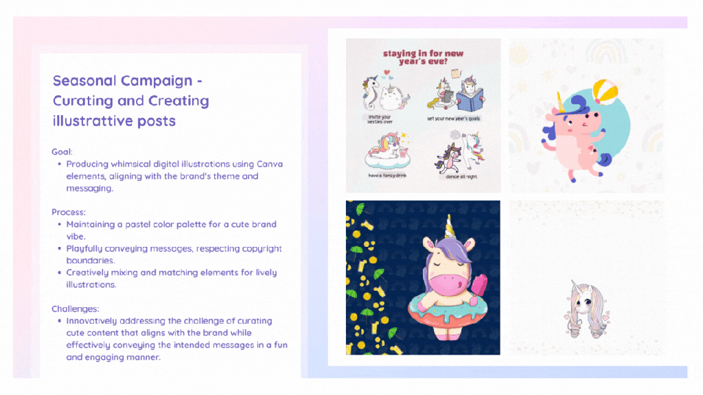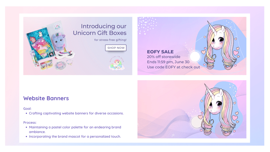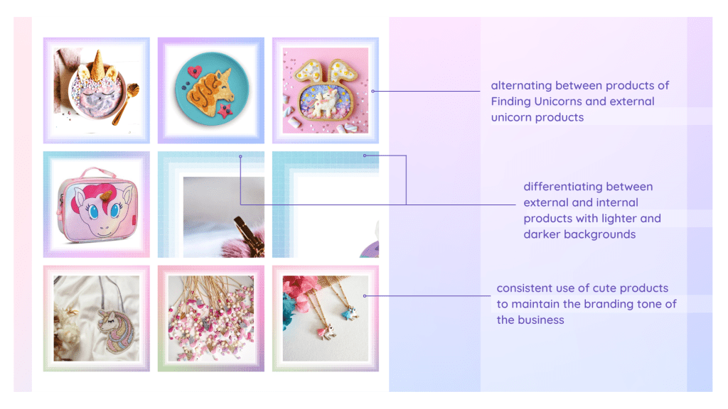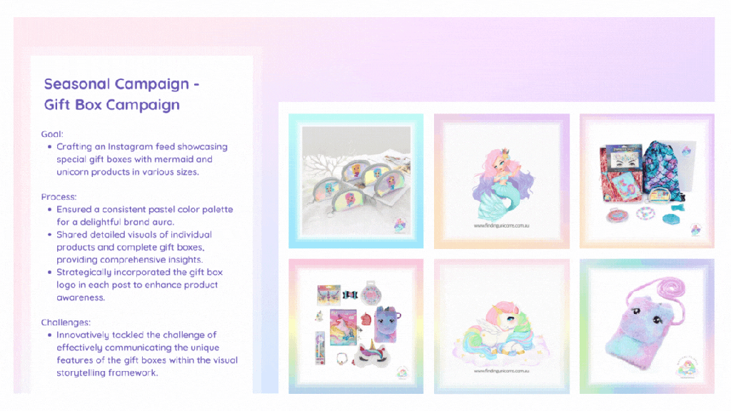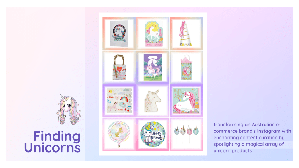 My collaboration with Debi commenced with refining the social media feed for her e-commerce venture, Finding Unicorns. The project, involving the creation of 7 weekly posts, evolved into a vibrant display. I introduced colorful borders to distinguish internal products, resulting in the feed seamlessly blended hues as users scrolled.